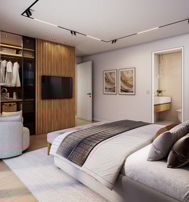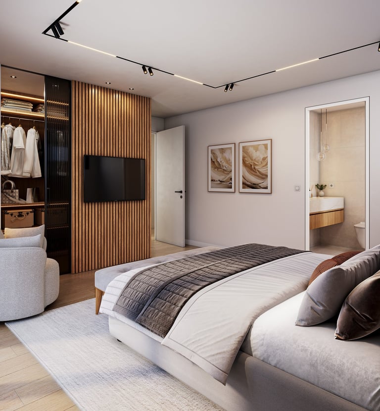 Designed for relaxation, this apartment includes a warm color palette and plush furnishings that invite you to unwind.